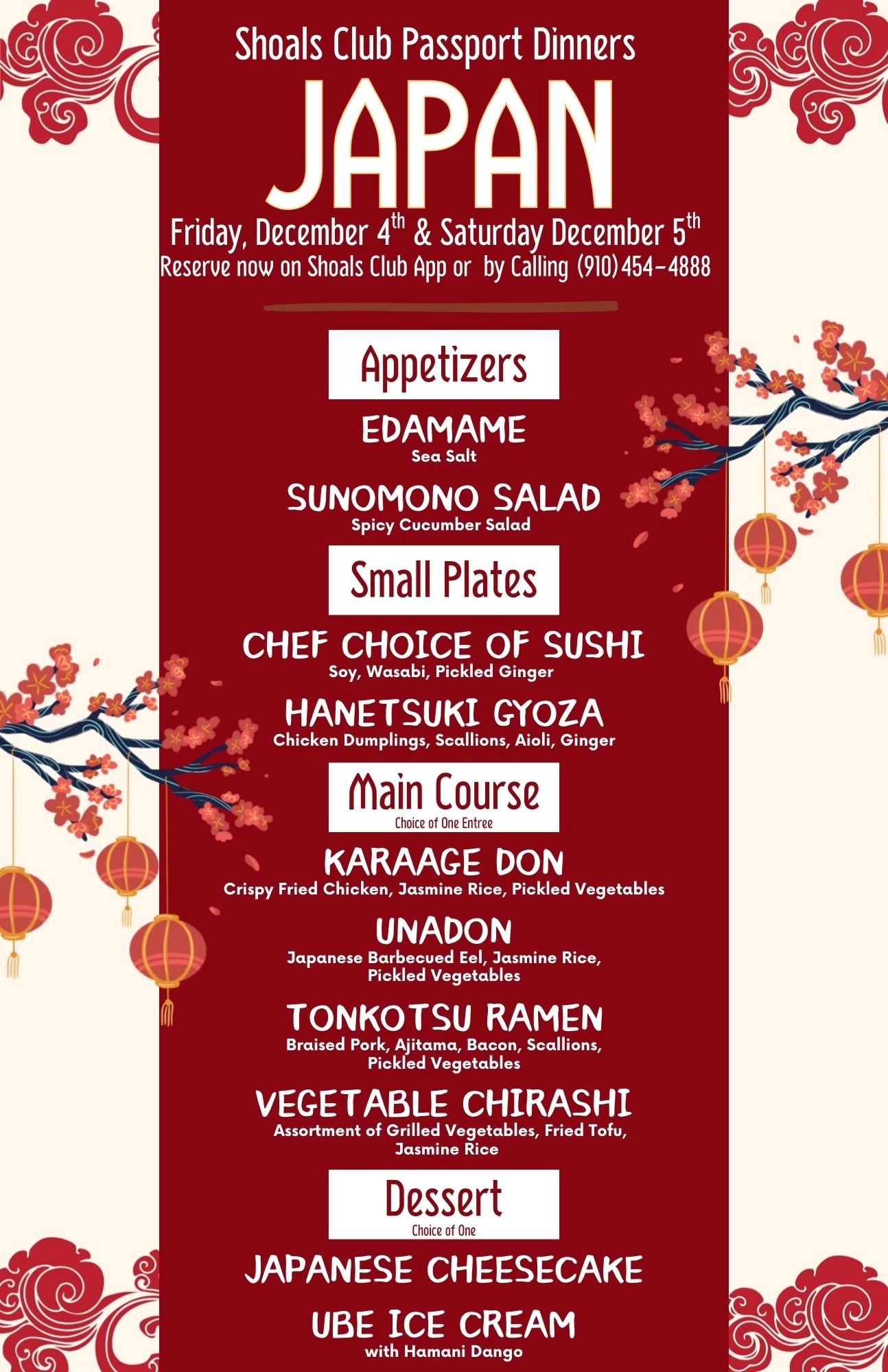 | 5th-6th | Fri & Sat | Aqua | International Passport Dinner-Japan |