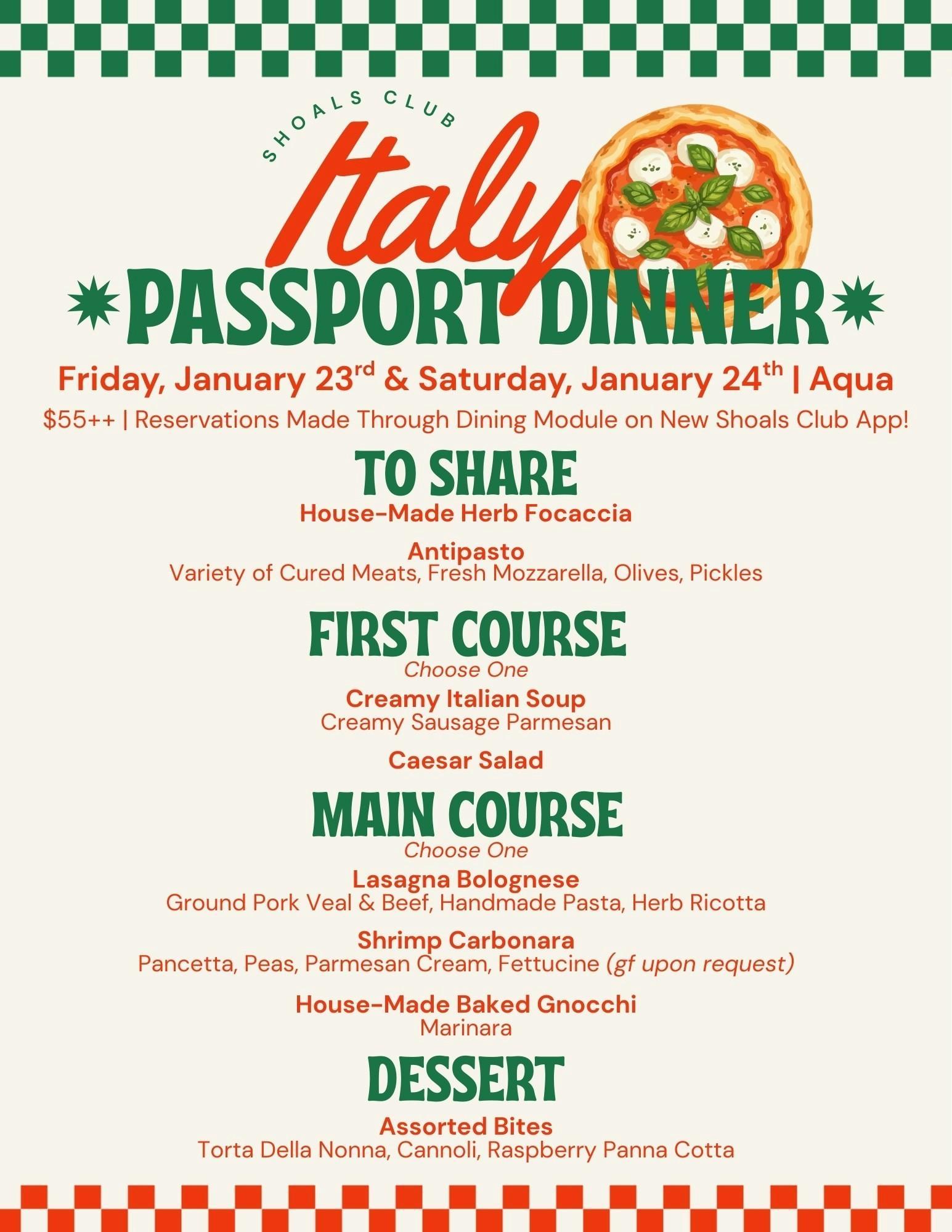 | 26th-27th | Fri & Sat | Aqua | International Passport Dinner-Italy |