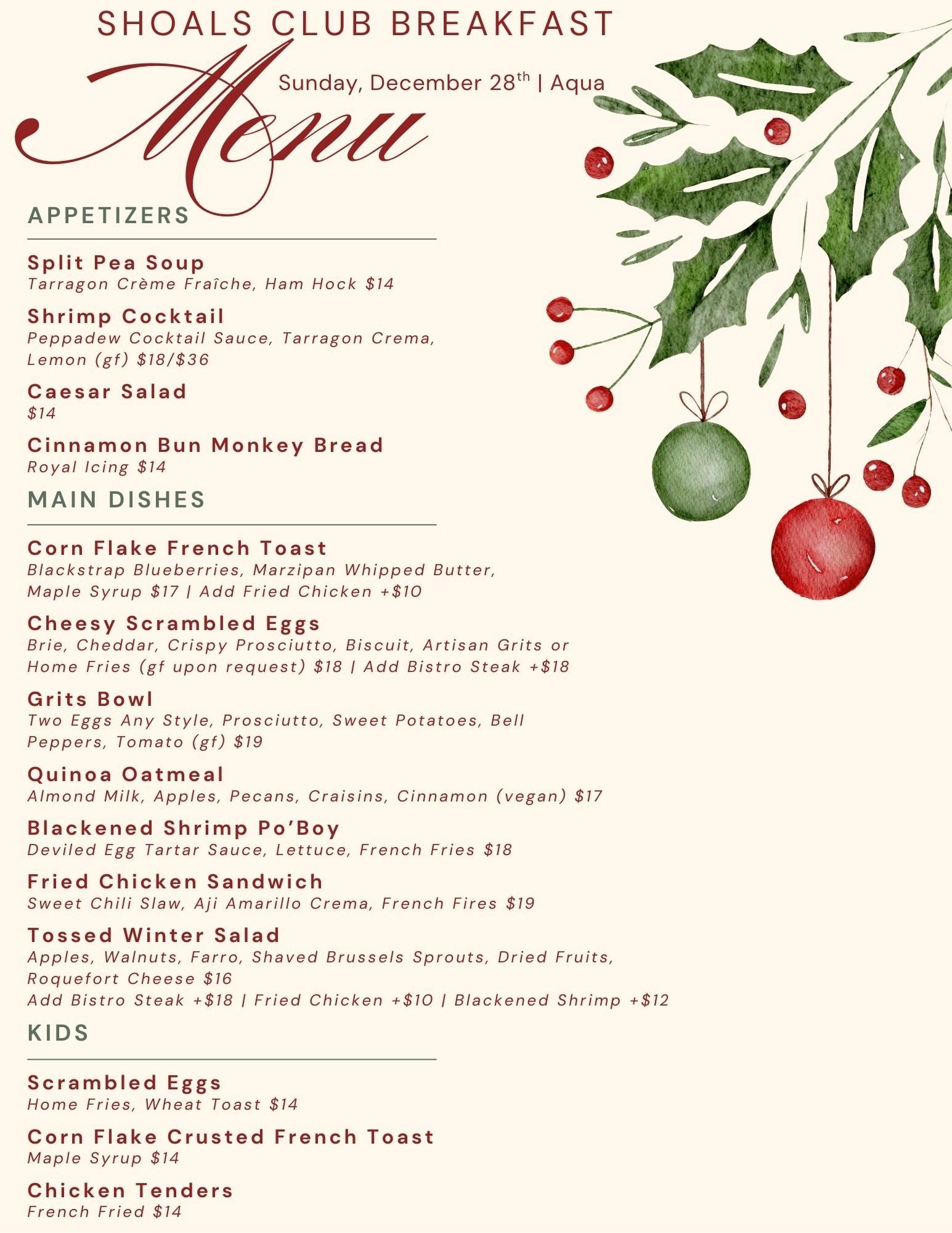 | 28th | Sun | Aqua | Holiday Break Breakfast/Brunch |