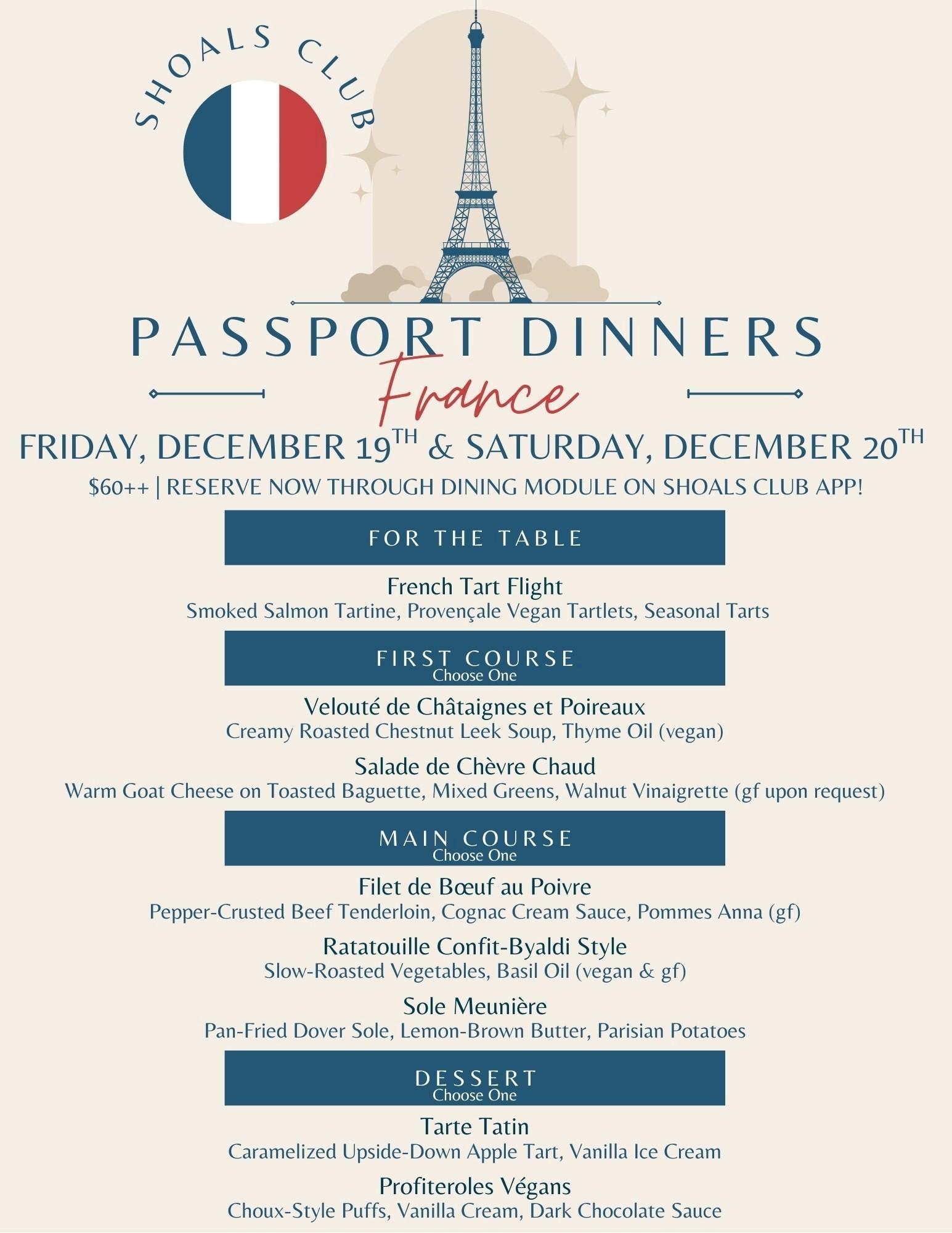 | 19th-20th | Fri & Sat | Aqua | International Passport Dinner-France |