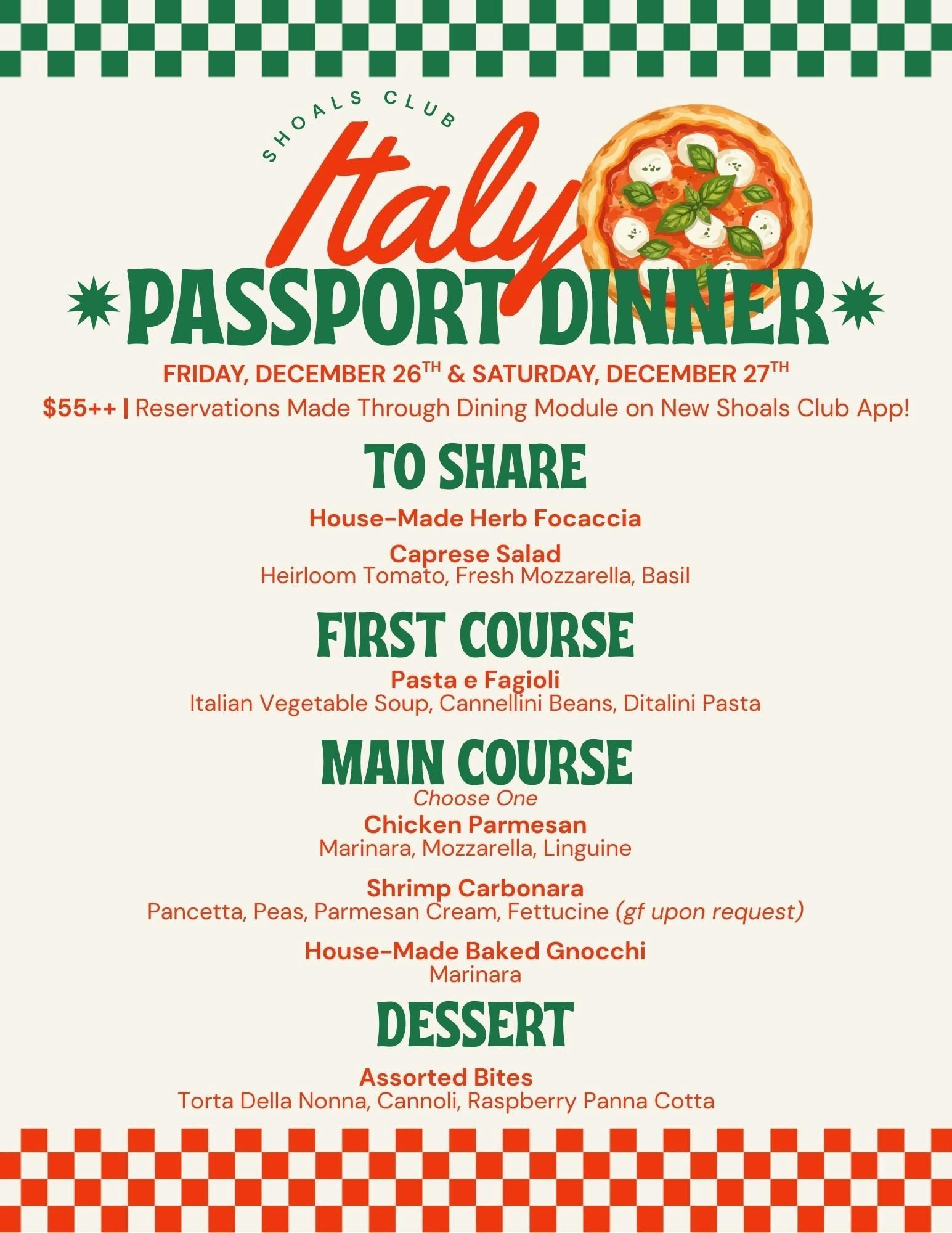 | 26th-27th | Fri & Sat | Aqua | International Passport Dinner-Italy |
