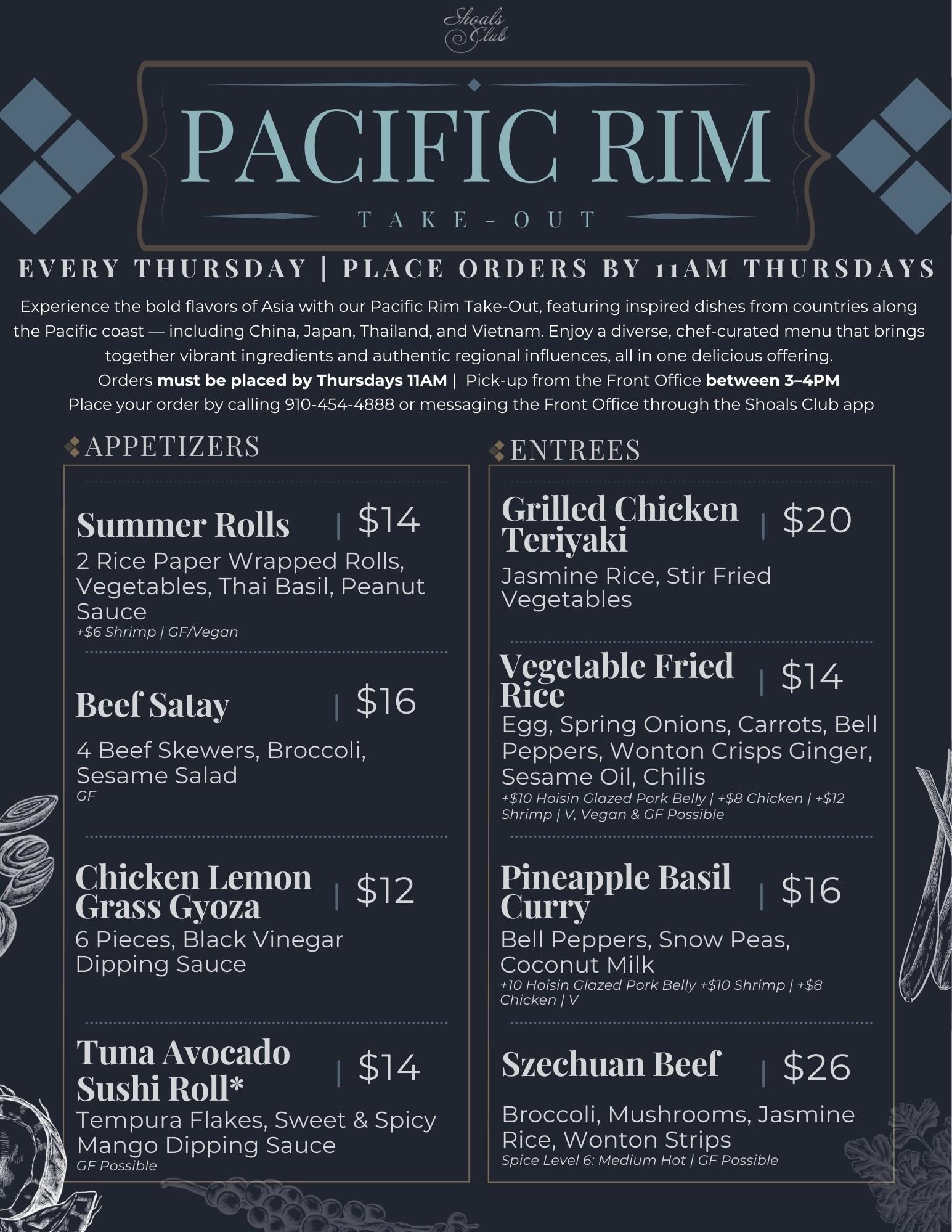 | 29th | Thu | Aqua | Pacific Rim Takeout |