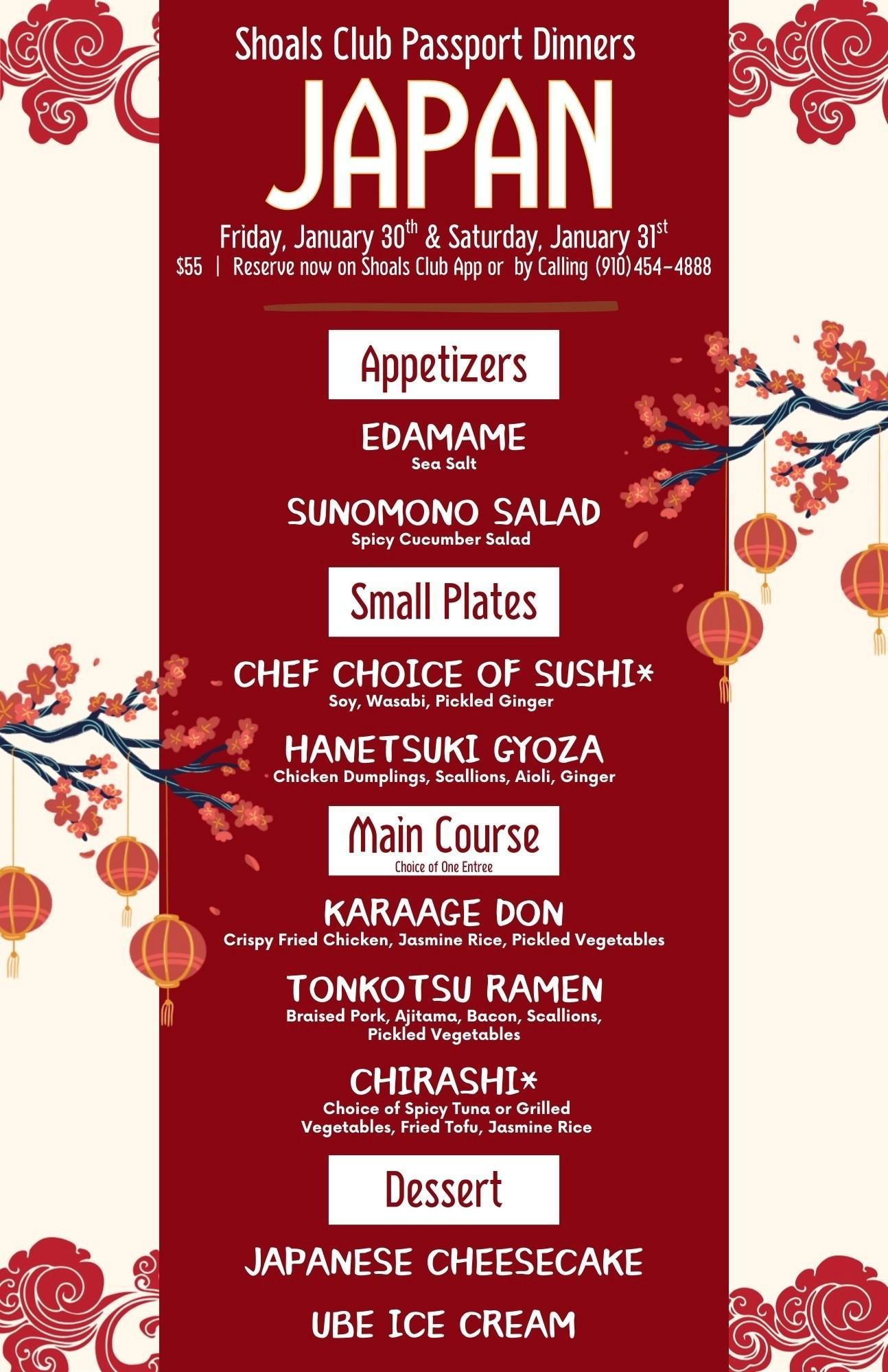 | 5th-6th | Fri & Sat | Aqua | International Passport Dinner-Japan |